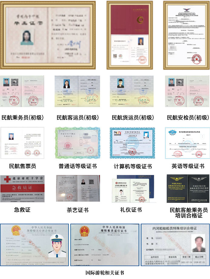 可根据所学专业,参加相关部门或行业组织的考试,成绩合格,可取得相应的职业资格证书。如:公共英语三级、普通话等级证书、安检证书、民航客运证书、急救证、礼仪证书、茶艺证书、民航客舱乘务员培训合格证、船员基本安全培训合格证、船舶保安意识培训合格证、国际航行船舶船员专业英语考试合格证明、客船船员特殊培训合格证等。